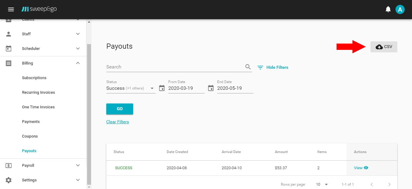 To export details of multiple payouts, please go to Employee Portal > Billing > Payouts > Show Filters and Choose a Date Range, then select “Go” > Click CSV icon.