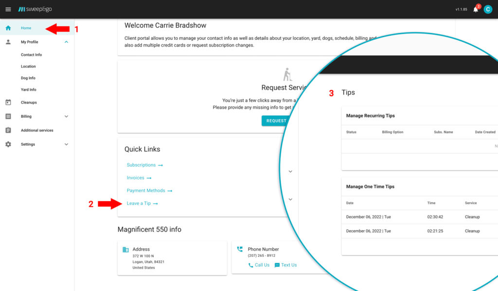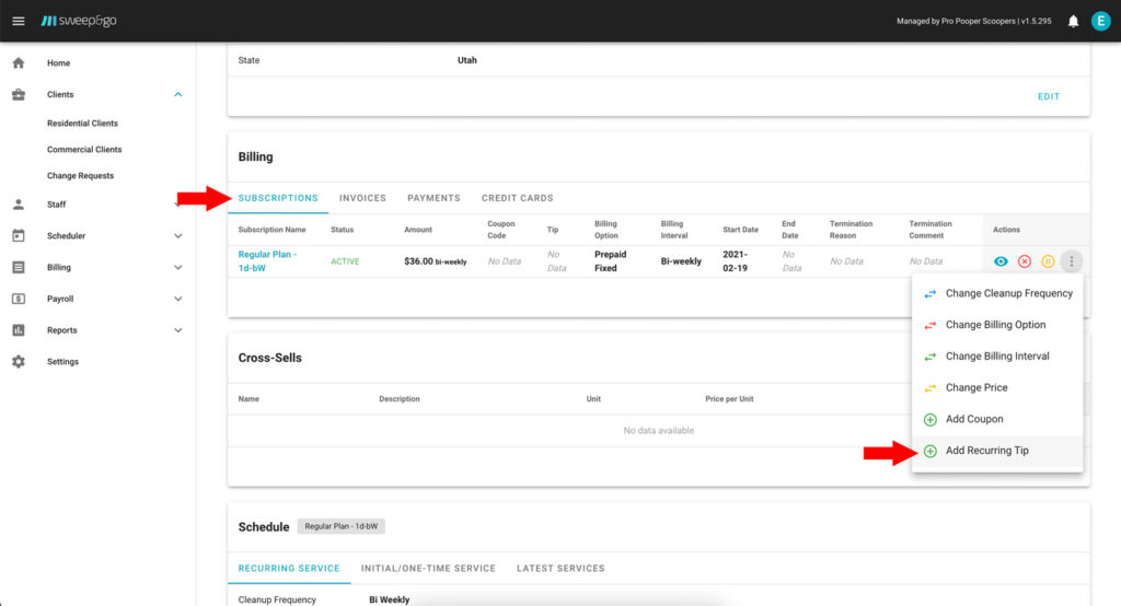 Recurring tips are added to client subscriptions.You may add a recurring tip to each active subscription. If you make any change to client subscription due to cleanup frequency or dog count change, recurring tip will be copied to the new subscription.