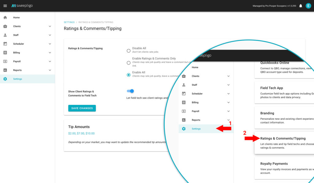 Ratings and Tipping are disabled by default. You may enable only staff ratings & comments or enable all ratings & comments and tipping. To enable ratings and tipping go to Settings > Ratings & Comments/Tipping. There you may also let field tech see client ratings and comments in the field tech app and update the recommended tip amounts.