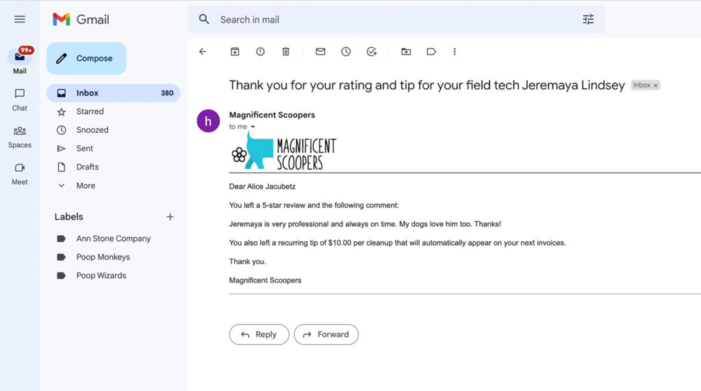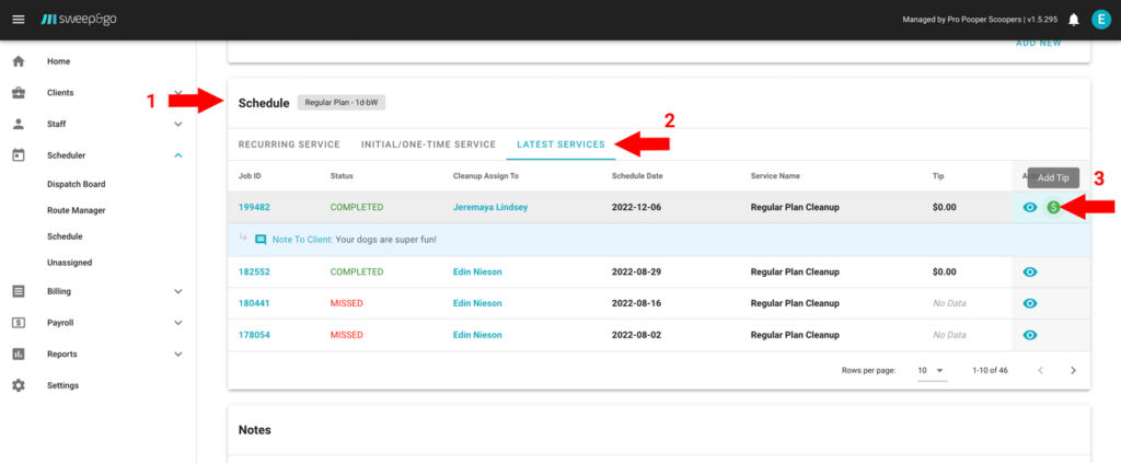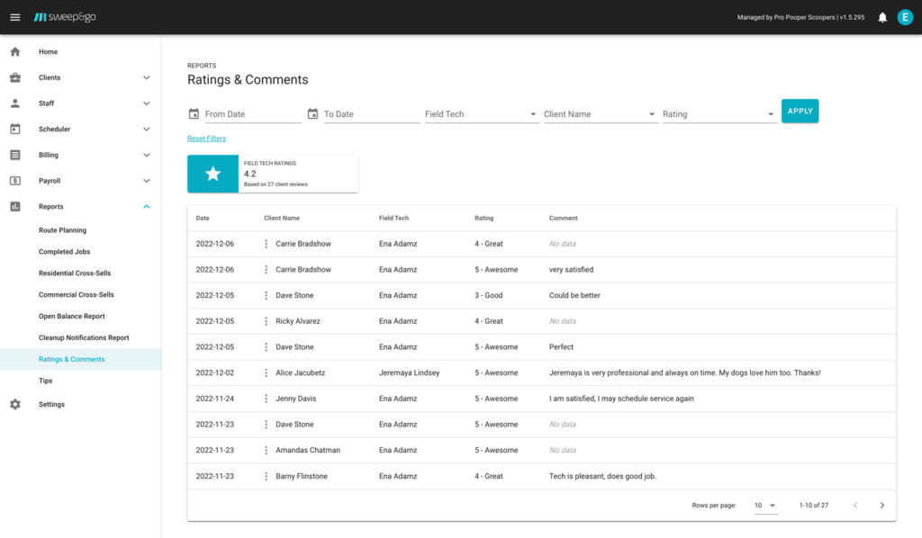 Clients may rate job quality, leave a comment and tip your field techs
