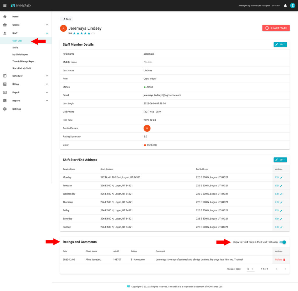 Ratings and comments are also displayed on each staff details view. Here you may delete comments if you want and you may allow or not tech to see client reviews within the field tech app.