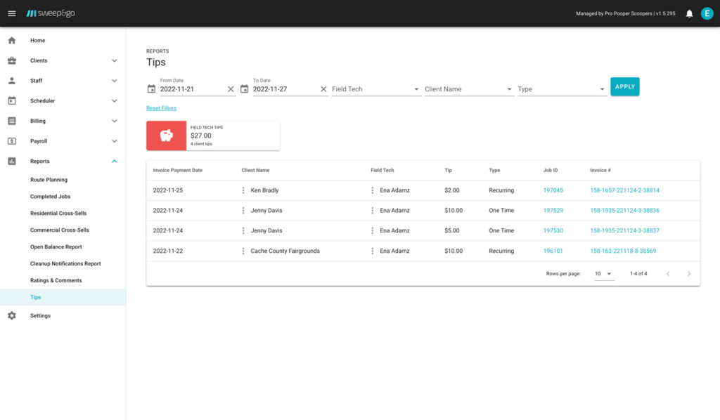 You may filter tips report by date, field tech, client name or tip type.