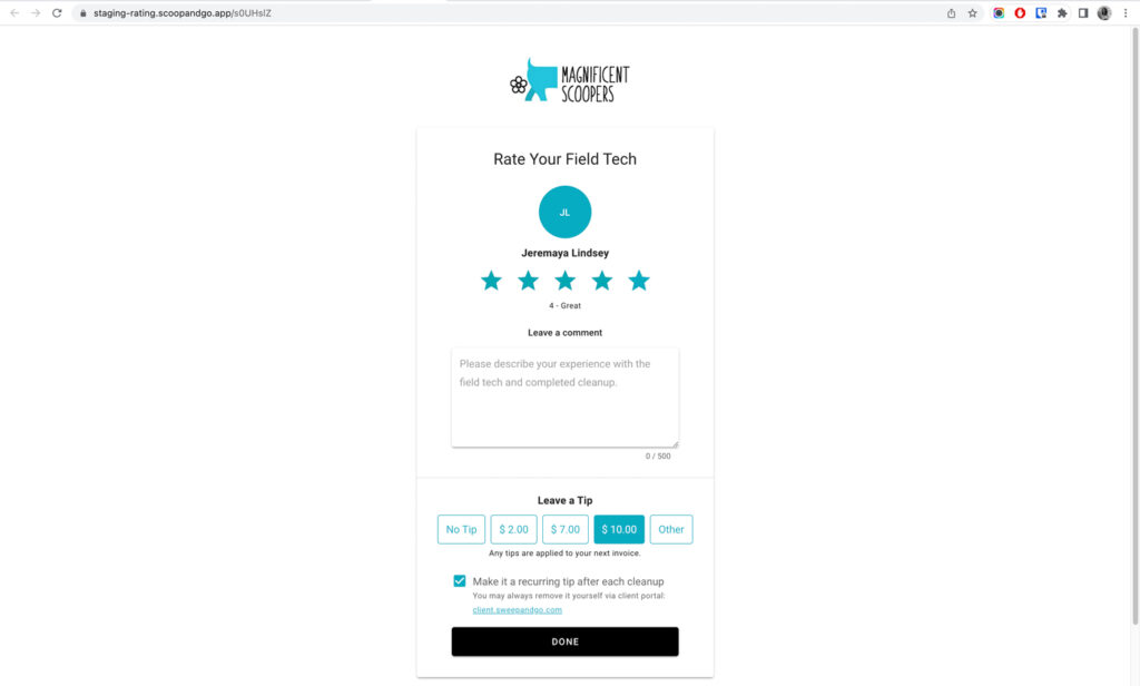 After opening the link, a client will be able to rate the tech, leave a comment and/or leave a tip. Clients may select a predefined tip amount or enter a custom amount. They may also leave one time tip or select a recurring tip checkbox. The selected tip amount will be added to their next invoice/s. The link expires after 24 hours or as soon as the client leaves a tip.