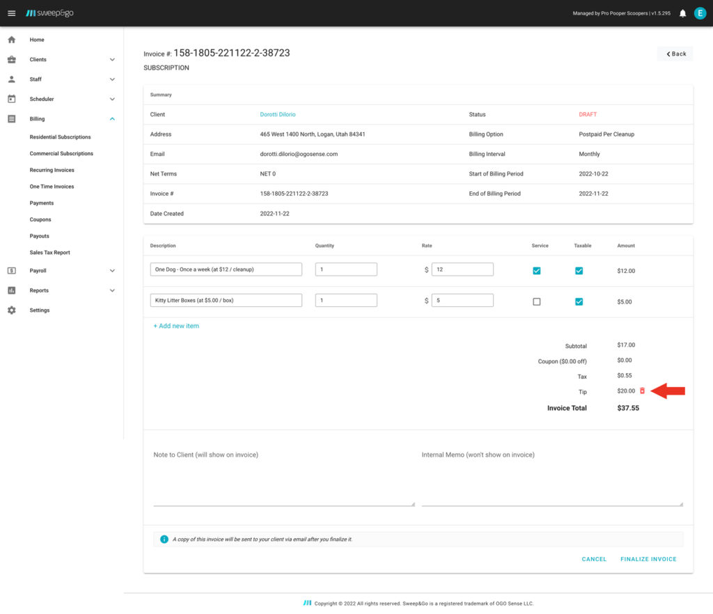 When there is a one time job, if the invoice draft is not finalized it will be updated after the client leaves a tip. If the invoice is finalized before the client leaves a tip it will be necessary to create another one time invoice draft to charge that tip. You will be notified about the tip by email and that tip will be added to the new invoice draft.