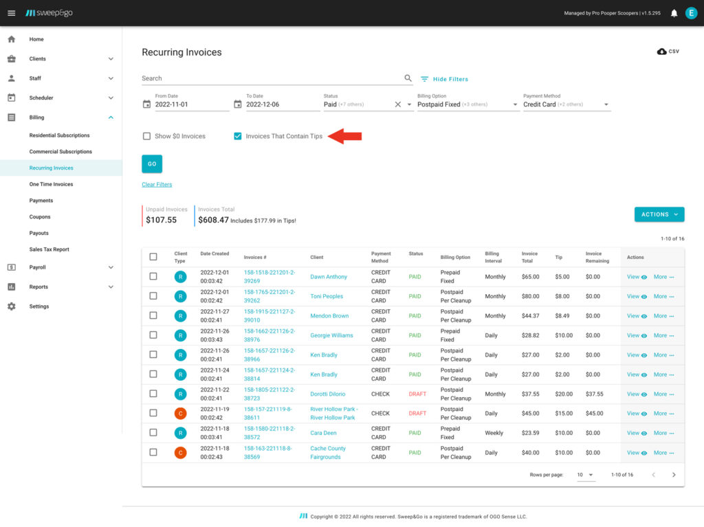 Tips will be sent to pay slips after invoices with tips are paid. More info about creating pay slips and payroll report can be found in these tutorials https://staging.sweepandgo.com/pooper-scooper-app/tutorials/payroll. You may check tips which will be included in the next payroll under Reports > Tips.