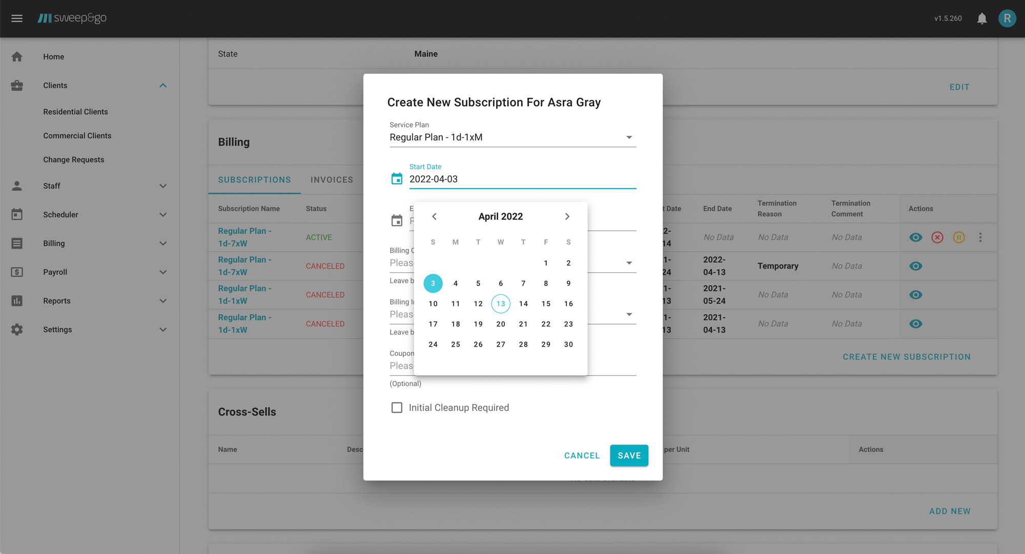 - Any subscription change (# of dogs, cleanup frequency, price change, etc) would not preserve the billing cycle. Current subscription is canceled and a created subscription begins on the present day. This requires you to cancel the newly created subscription and create another one manually by choosing the same date in the past as the original subscription start date.