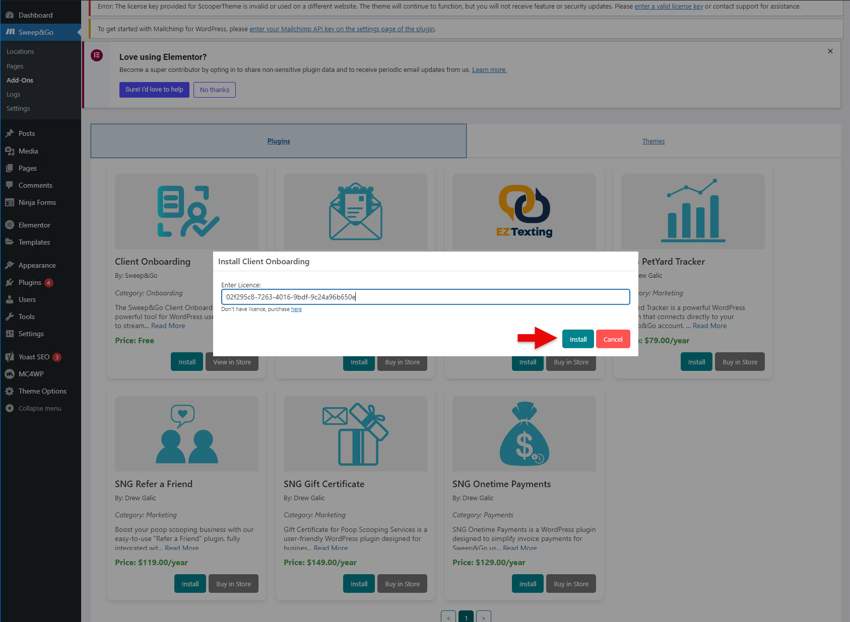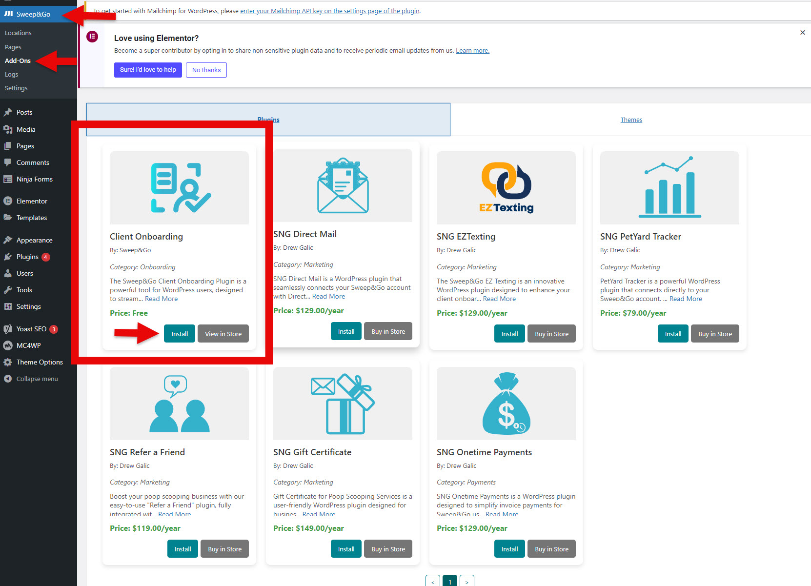 13. From there go to “Sweep&Go” > “Add-Ons” > Click on “Install” to install the Client Onboarding plugin