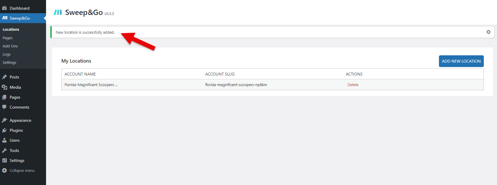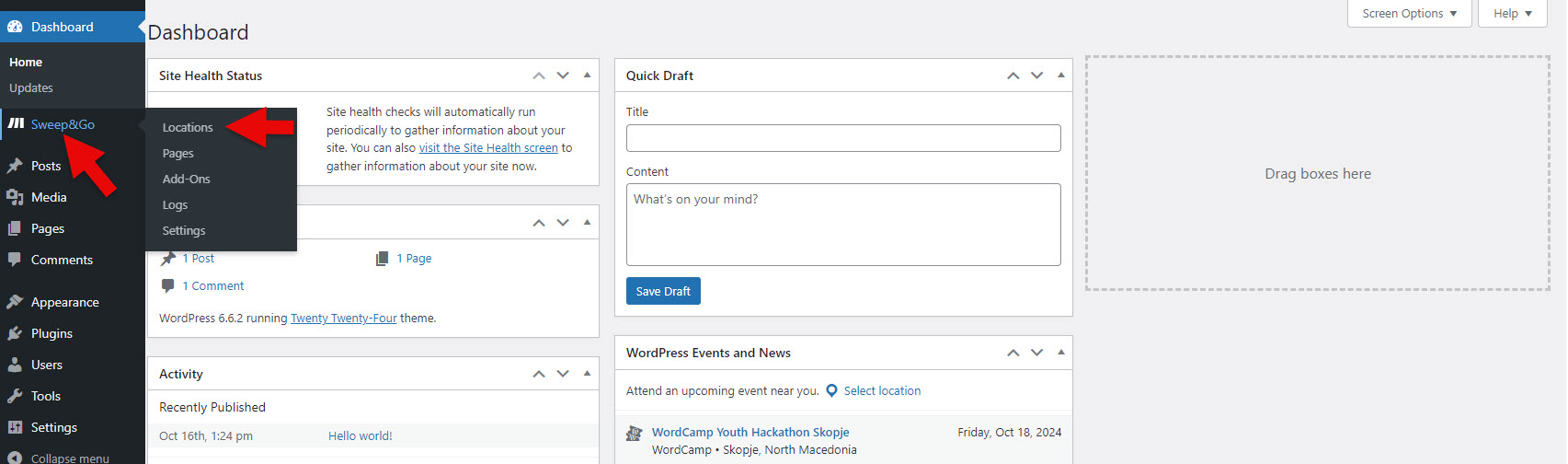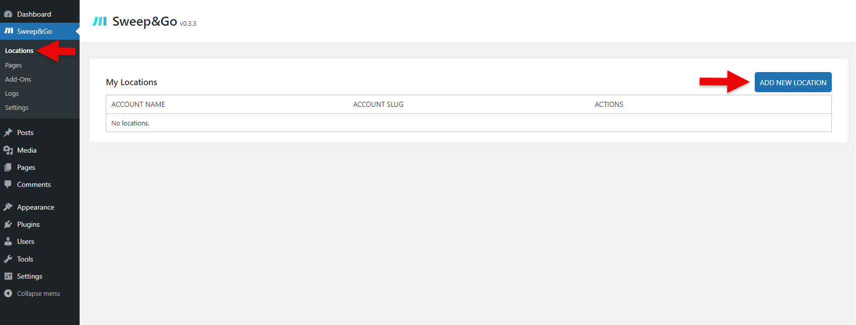 7. After the plugin activation on your left sidebar go to “Sweep&Go” and click “Locations”