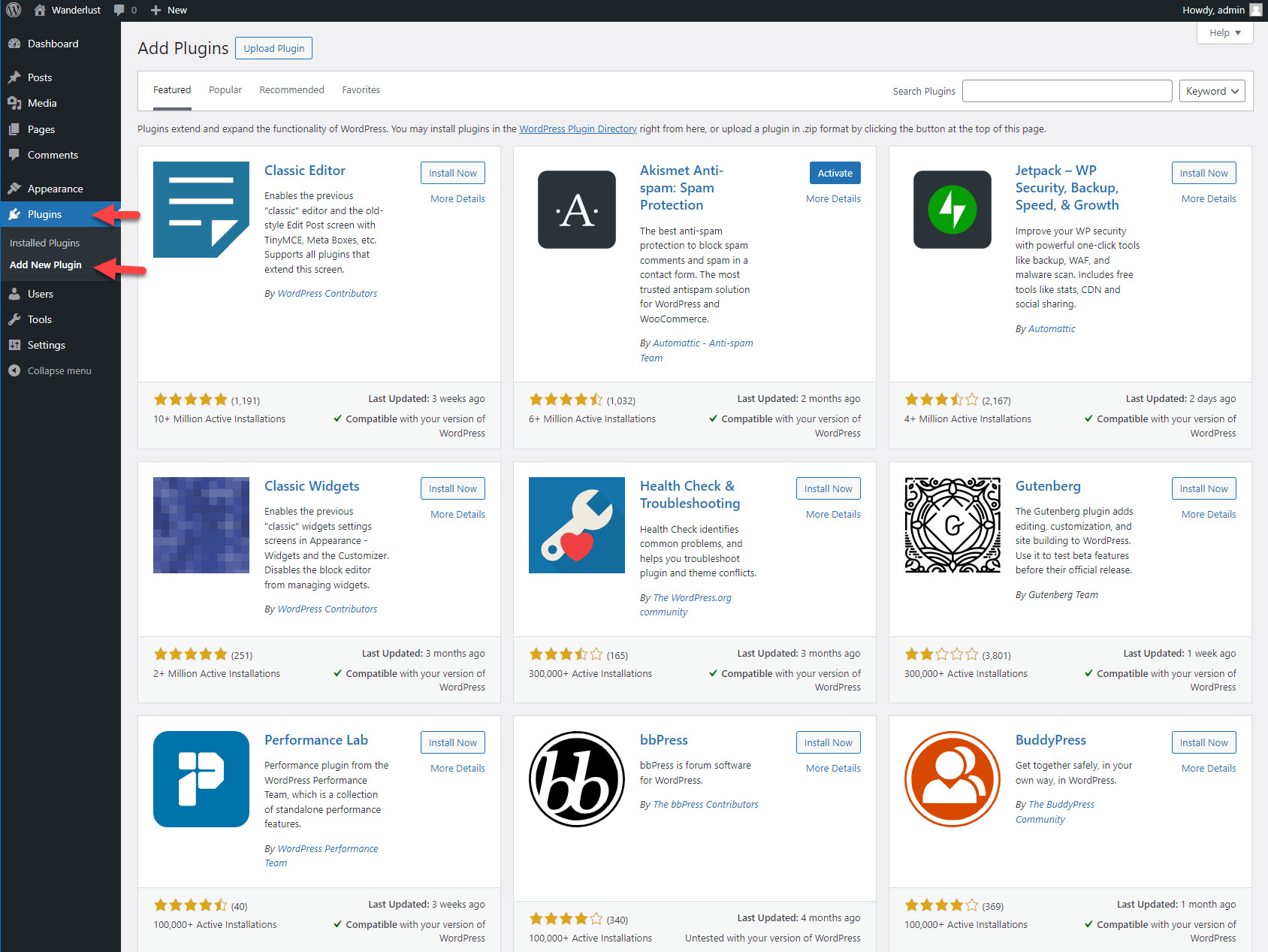 - Go to the WordPress dashboard and on the left sidebar, find “Plugins” and click “Add New Plugin”: